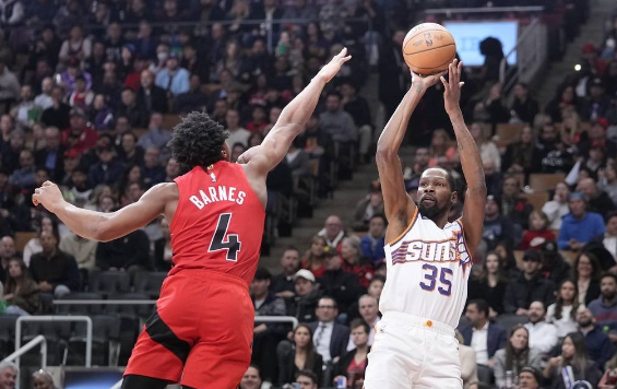 太陽隊首發(fā):凱文-杜蘭特、尤素福-努爾基奇、約什-奧科吉、埃里克-戈登、德文-布克